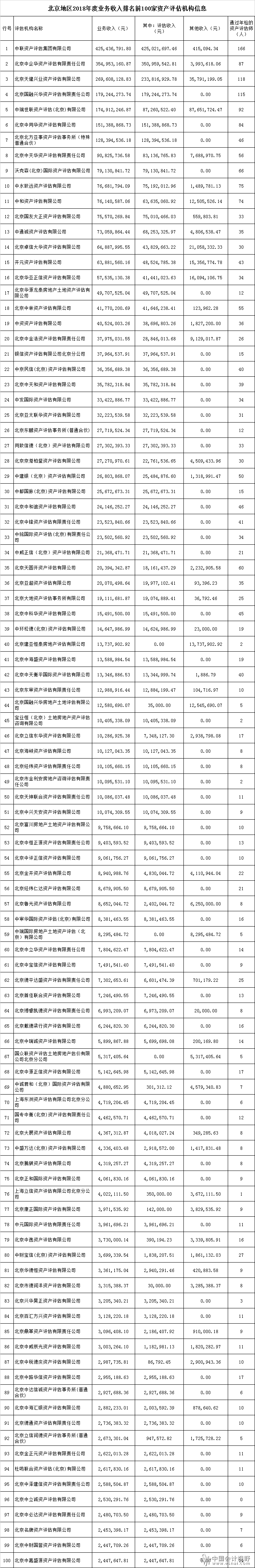 中國(guó)會(huì)計(jì)視野訊 北京資產(chǎn)評(píng)估協(xié)會(huì)發(fā)布《關(guān)于發(fā)布北京地區(qū)2018年度業(yè)務(wù)收入排名前100家資產(chǎn)評(píng)估機(jī)構(gòu)相關(guān)信息的通知》,中聯(lián)、北京中企華、北京天健興業(yè)、北京國(guó)融興華、中瑞世聯(lián)(北京)排在前五位。