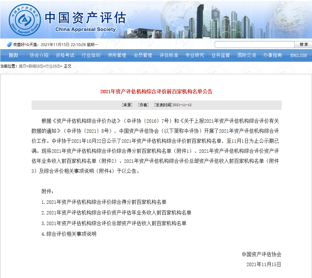 原始鏈接:中評協丨2021年資產評估機構綜合評價前百家機構名單公告(http://www.cas.org.cn/xwdt/xydt/65167.htm)