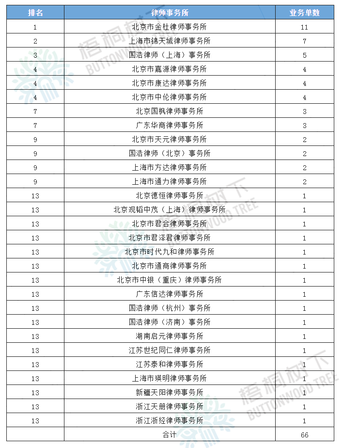 2020年全年,共有29家律師事務(wù)所成功承辦了64單并購(gòu)重組項(xiàng)目法律業(yè)務(wù),東貝B股、大連港聘請(qǐng)兩家律所,故總數(shù)為66單。