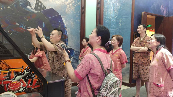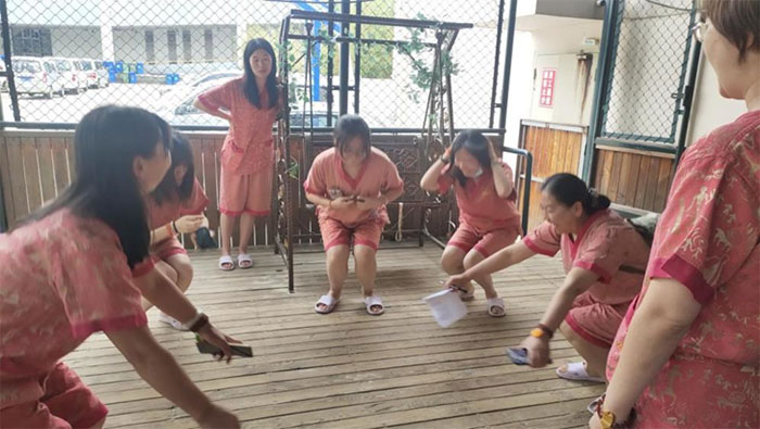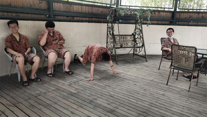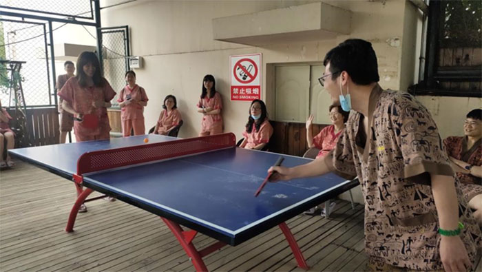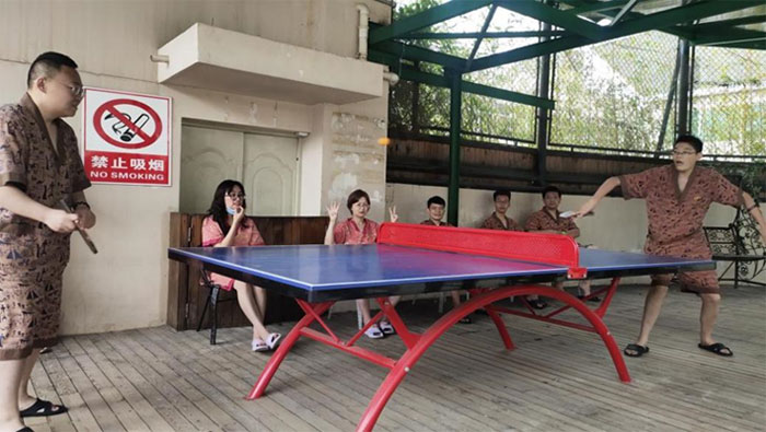 第二天早上,進行了激烈但友好的體育比賽團體活動。活動分為分組投籃比賽和乒乓球比賽,設置了得最后一名的團體將接受適當的懲罰。
